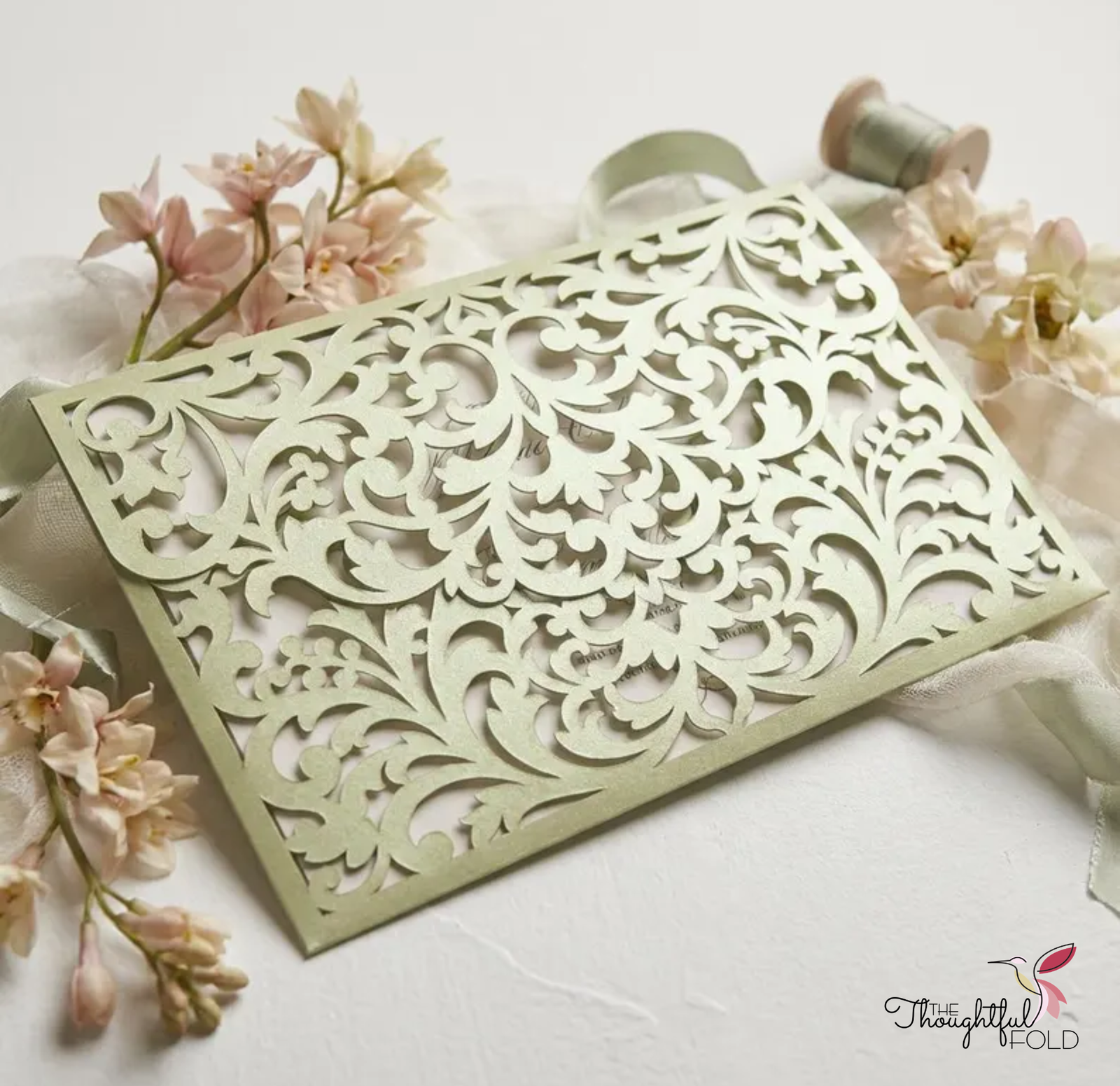 Add an elegant finishing touch to your wedding stationery with this Lace Cutout Invitation Envelope. The intricate lace design creates a beautiful wrap that holds your invitation, RSVP card, and additional inserts in a stylish presentation. Each piece is carefully handcrafted and can be created in any color of your choosing to match your wedding theme. A proof will be sent for approval before printing.